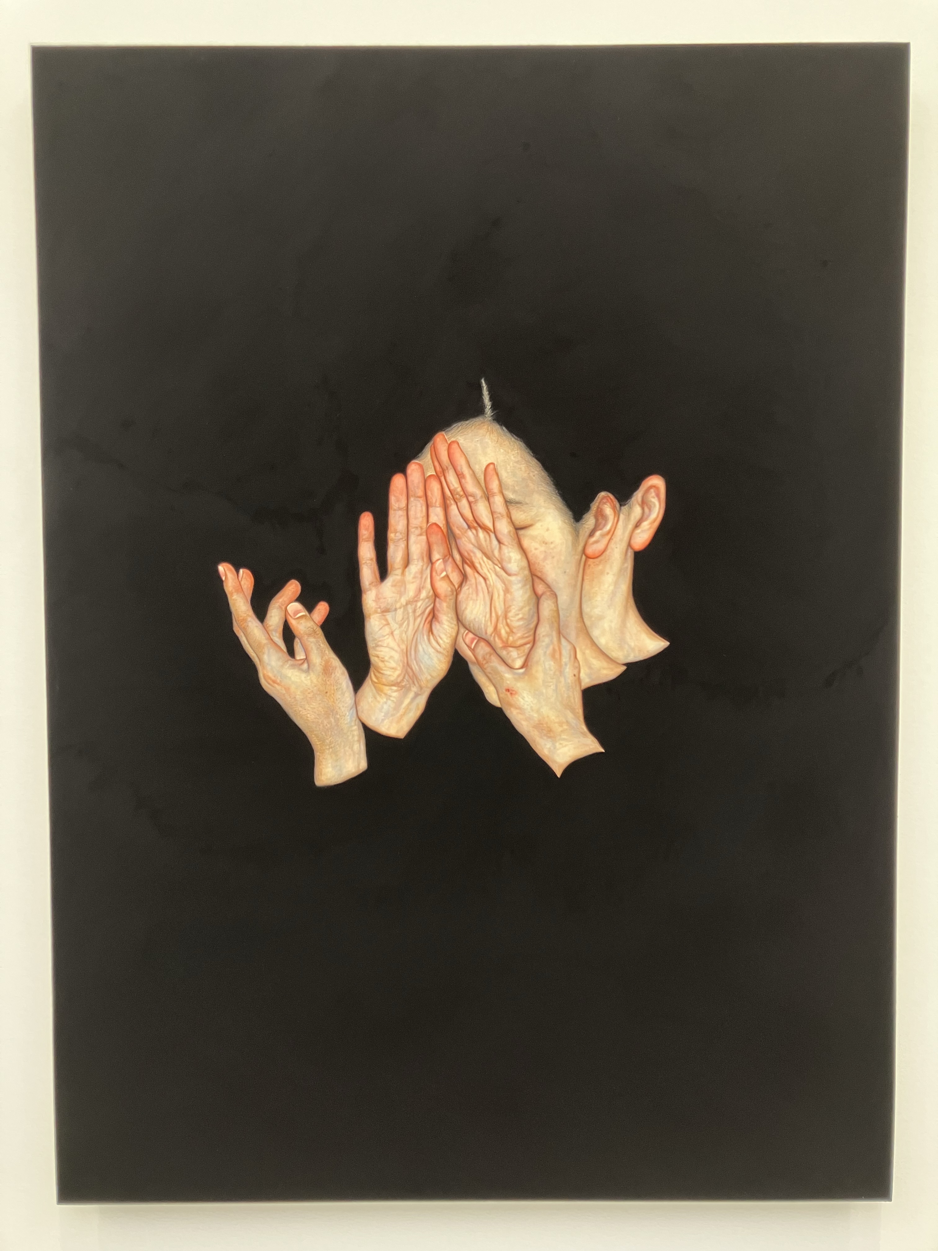 Lee’s paintings were visceral – in person, the black of the paintings is flat and absolute, no visible marks from its making. The hands and face are hyper-realistic, hairs and blemishes rendered in detail without softening or blurring. In all of the paintings the face and hands are doubled, with the hands either performing the same gesture or in opposition to each other (as seen in Blazing Radiance, below).