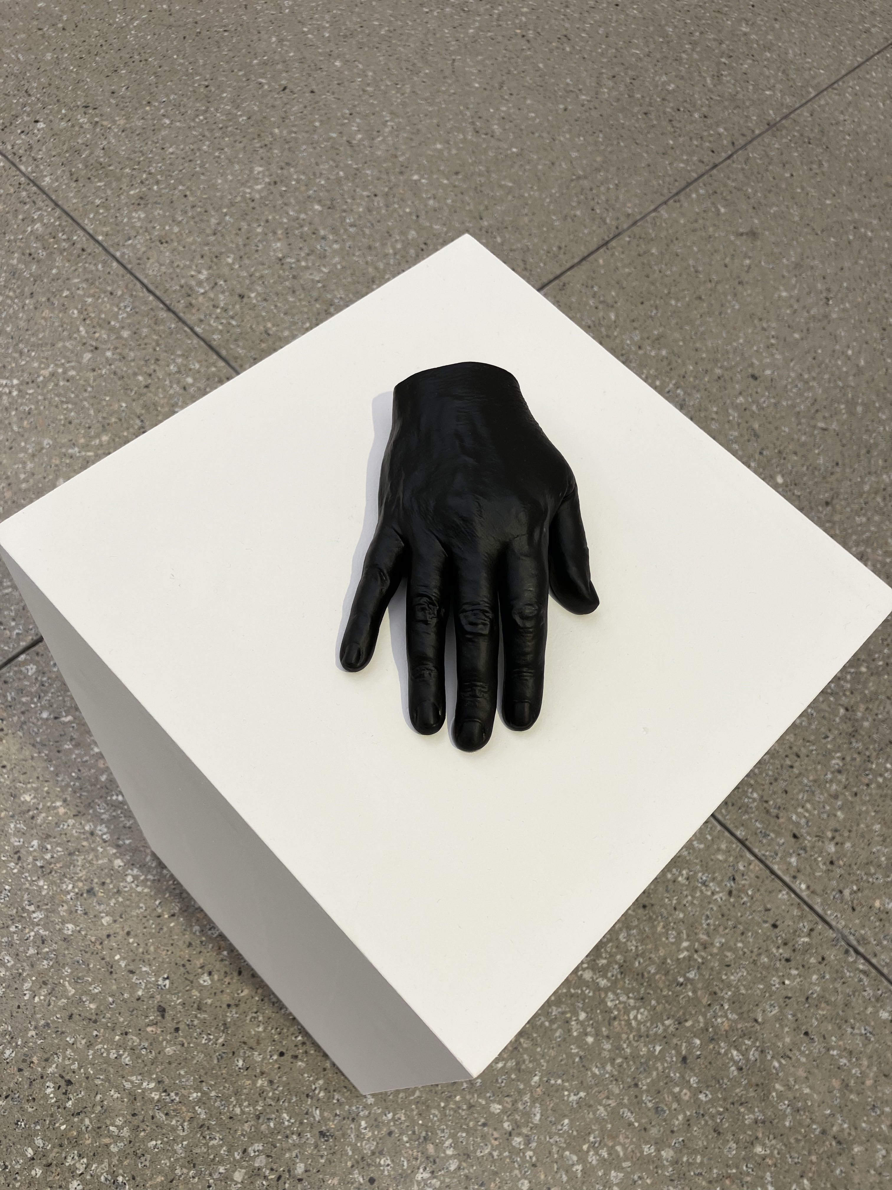 Fritsch’s “Hand” was uncanny – the matte black making it difficult to see the details of the hand, while knowing they were there. Initially I thought it was metal, such was the weight and presence given by the black acrylic paint. Having made a series of cast hands in Sculpture I, so many years ago, it reminded me of the pain I experienced dipping my hand into paraffin wax to for plaster casting and wondered: how was this piece cast?