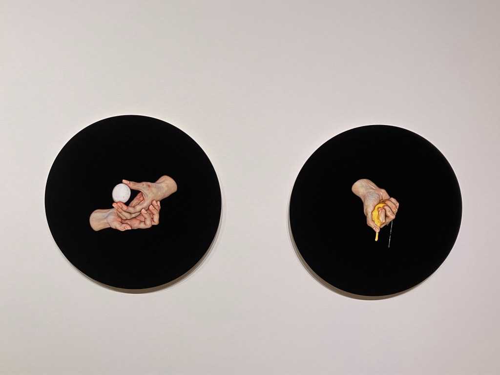 There were also several more works by Lee Jinju! In the round series of paintings, hands are shown holding, crushing, separating eggs. I failed to get notes on this series, and there isn’t much information online, but it’s interesting to see a similar technical approach have such a different feel – almost cold, removed? – when the subject shifts in a subtle way. Also shown, was a sculptural painting of a figure, standing about the height of a person. I have no idea what’s happening here, but this work repeated the act of hiding that was in other, similar paintings of anonymous women in strange places trying to hide. I’ll be looking more into Lee’s work!